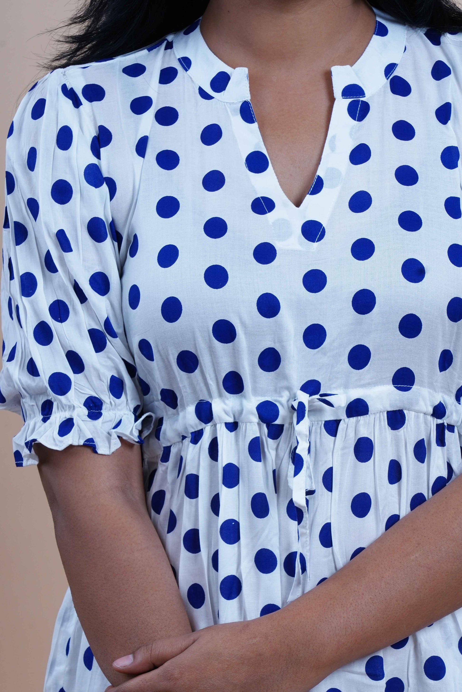 Blue Polka Dots Printed Cotton Empire Midi Dress