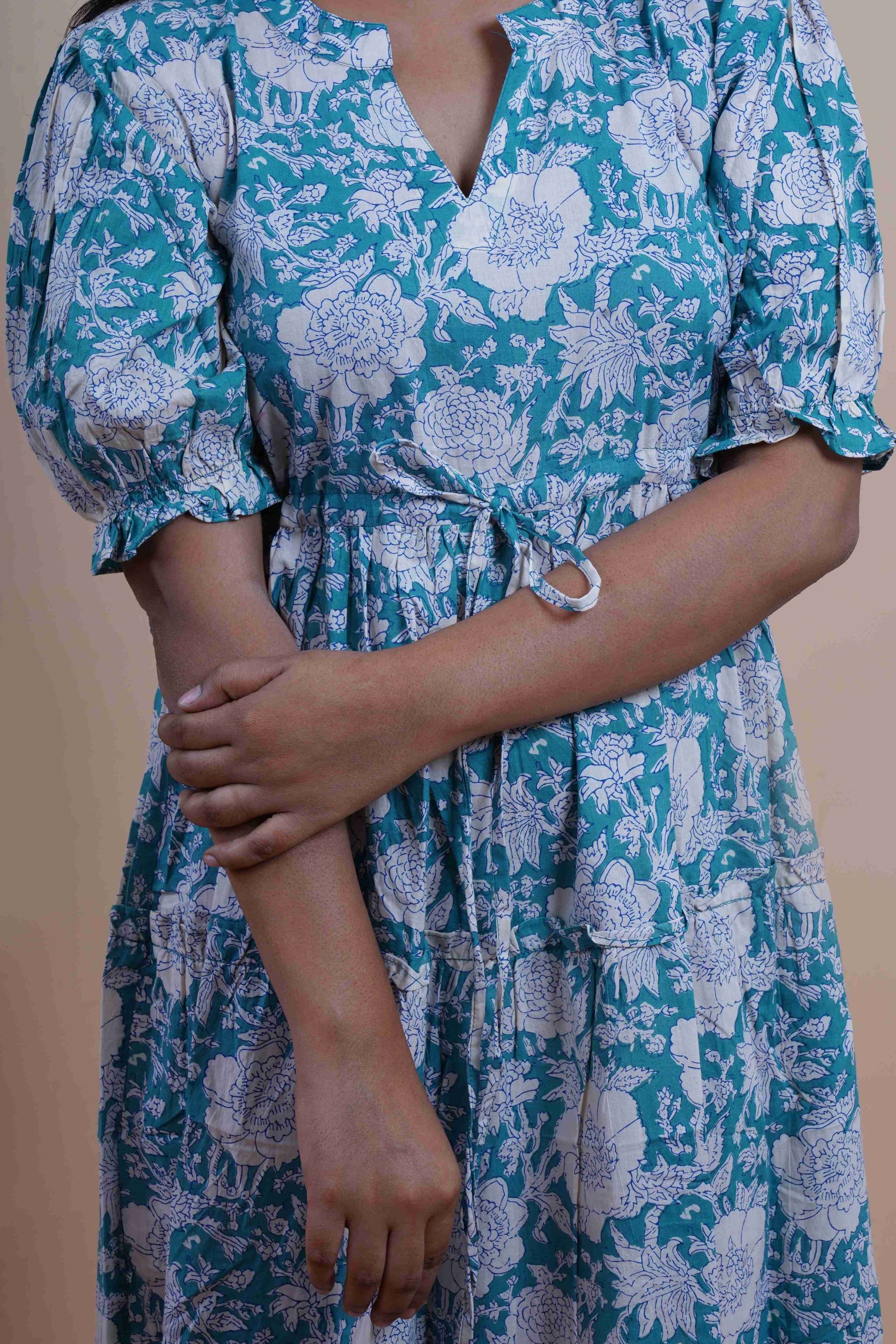 Teal Floral Printed Cotton Empire Midi Dress