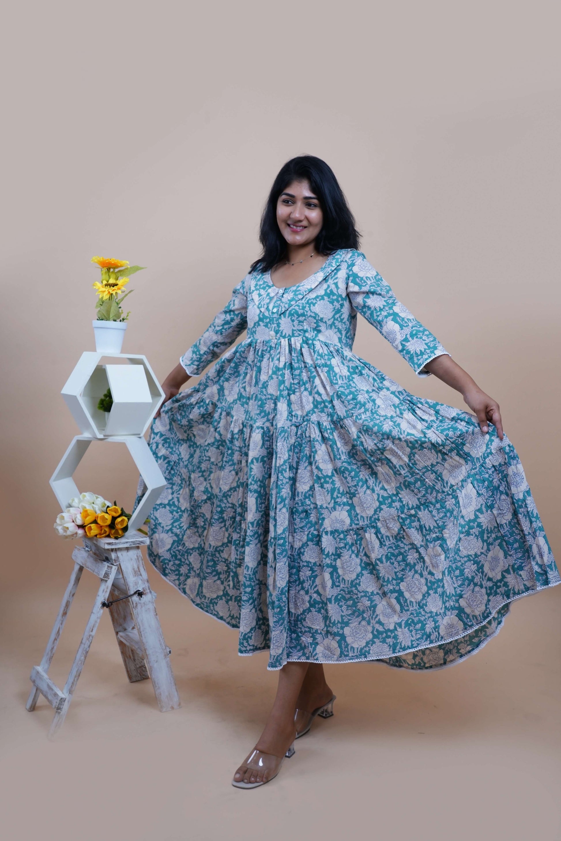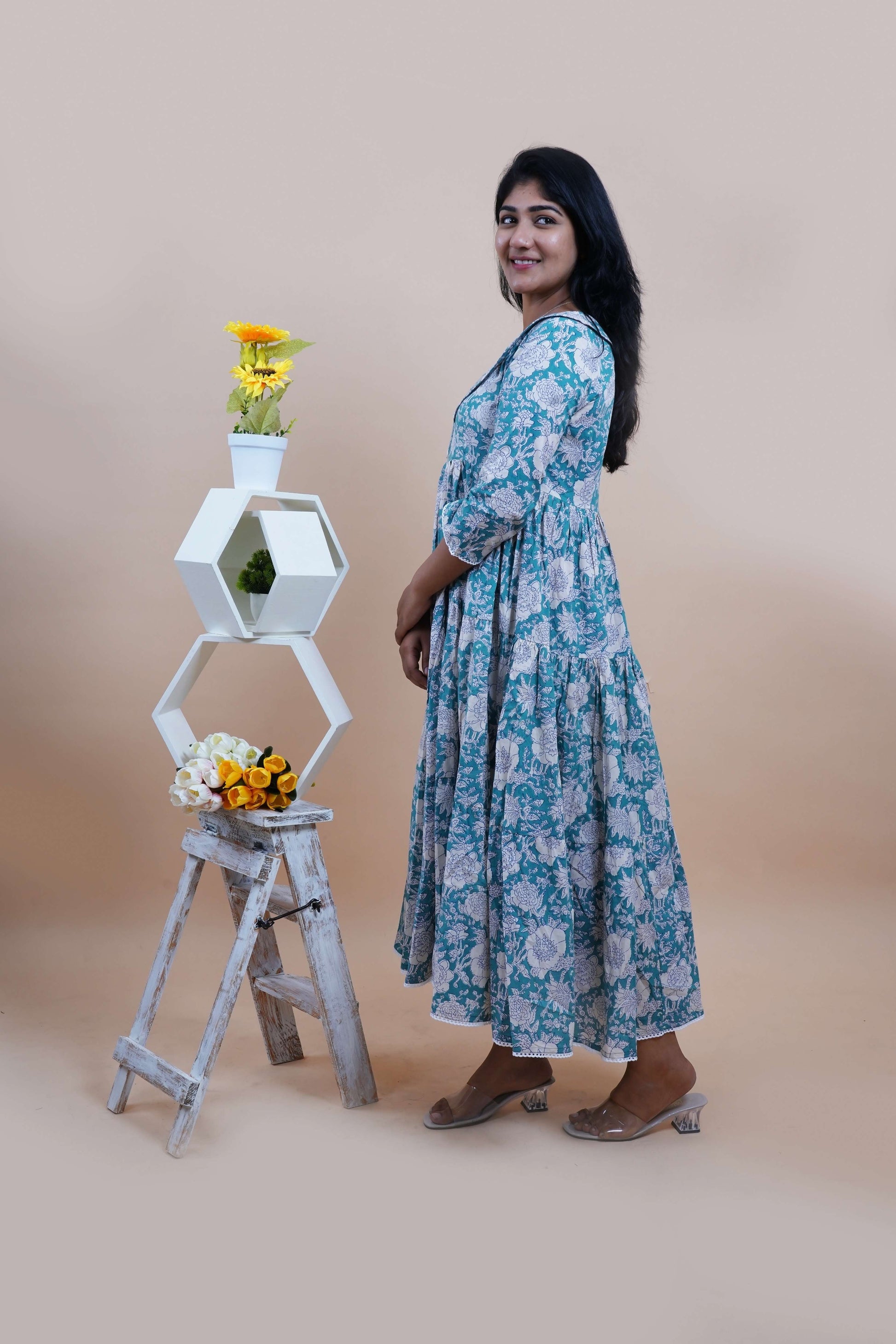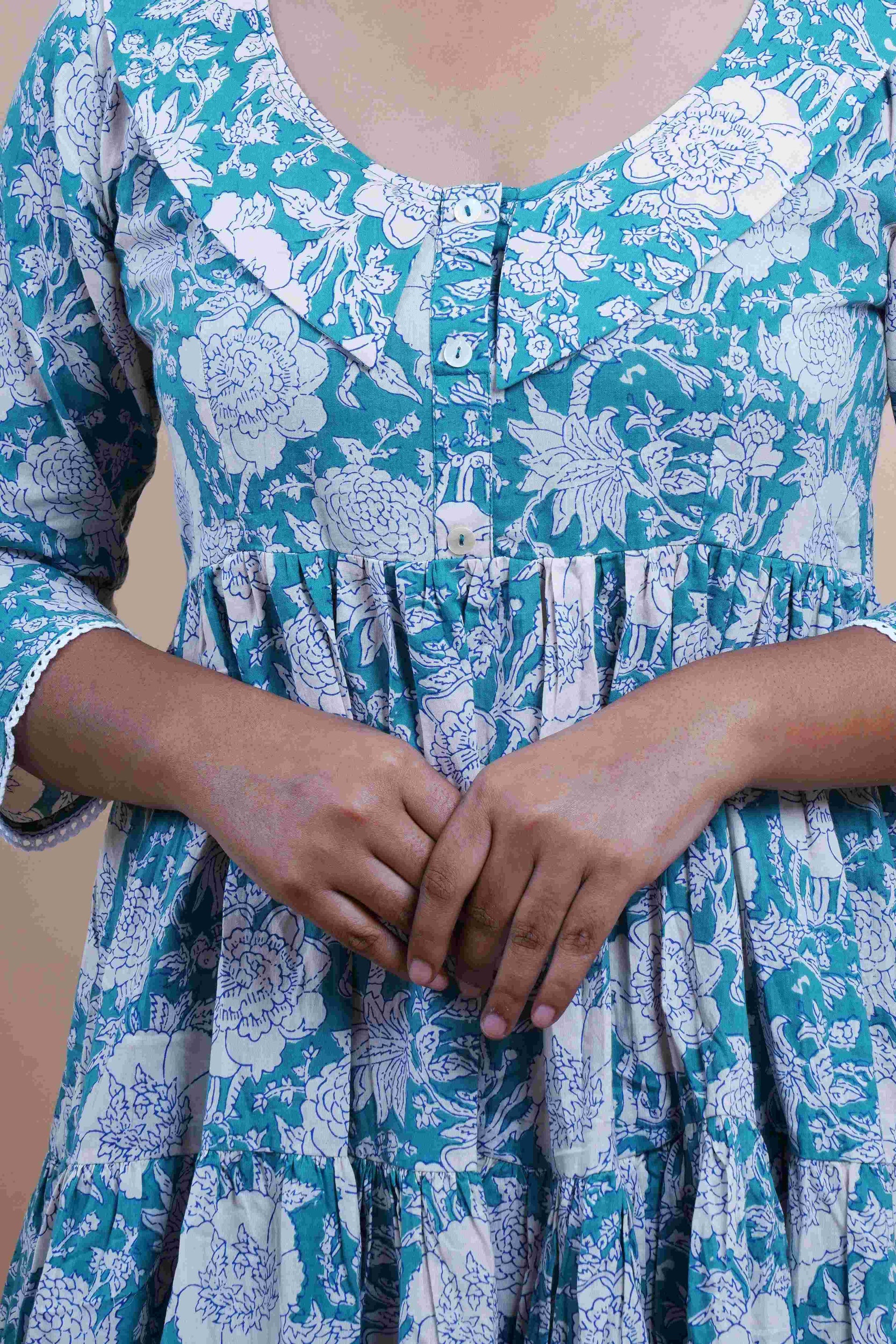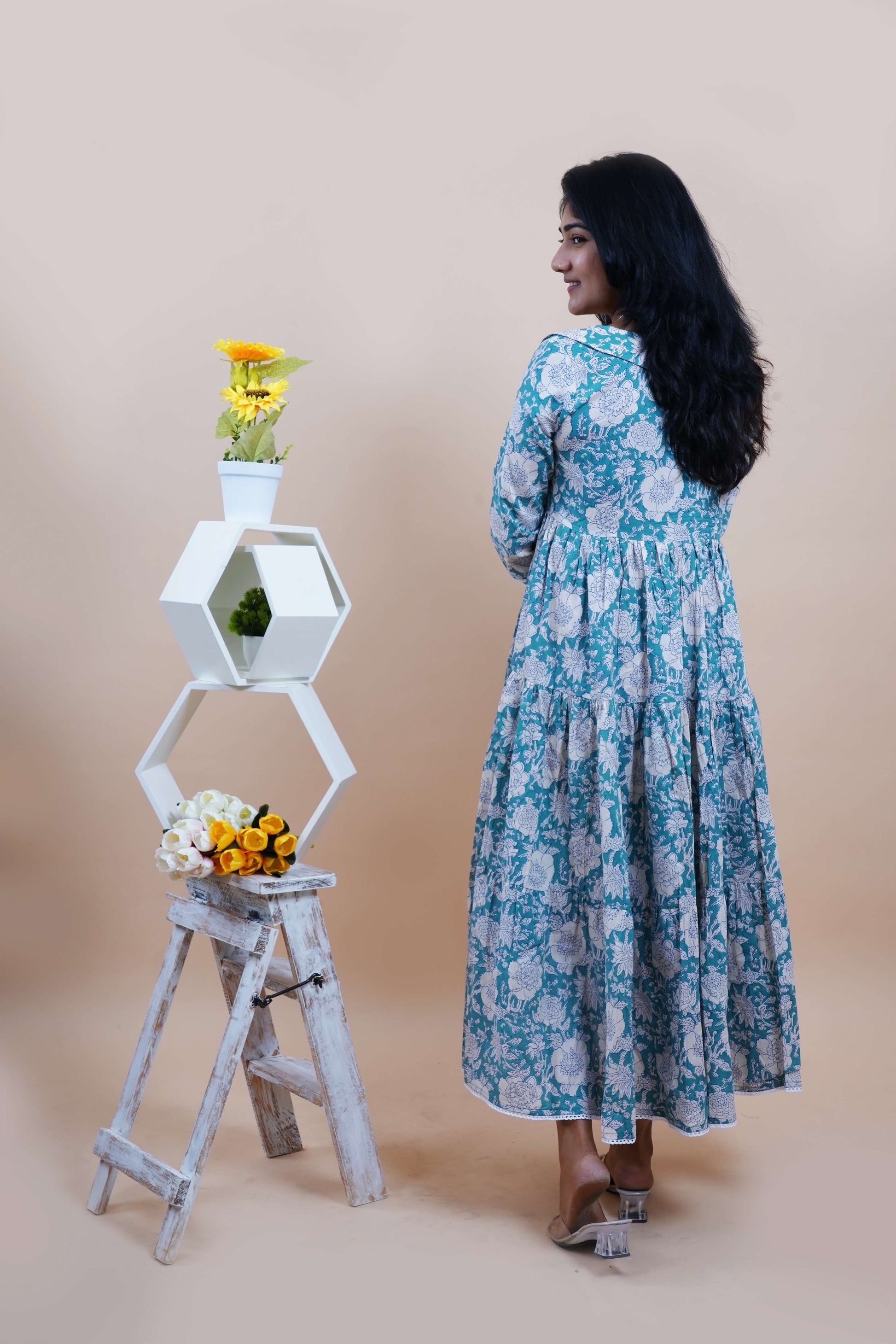 Teal Floral Printed Peter Pan Collar Tiered Fit & Flare Maxi Dress