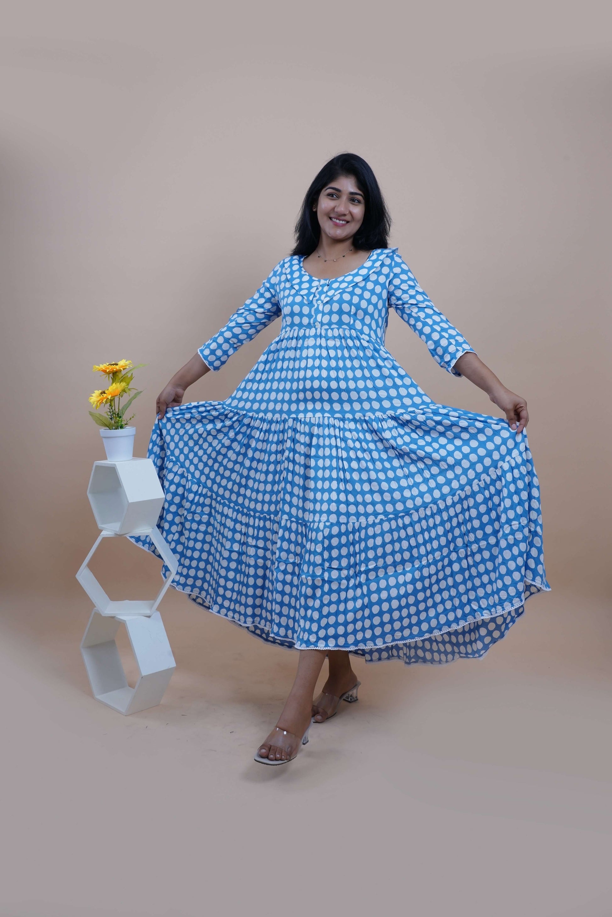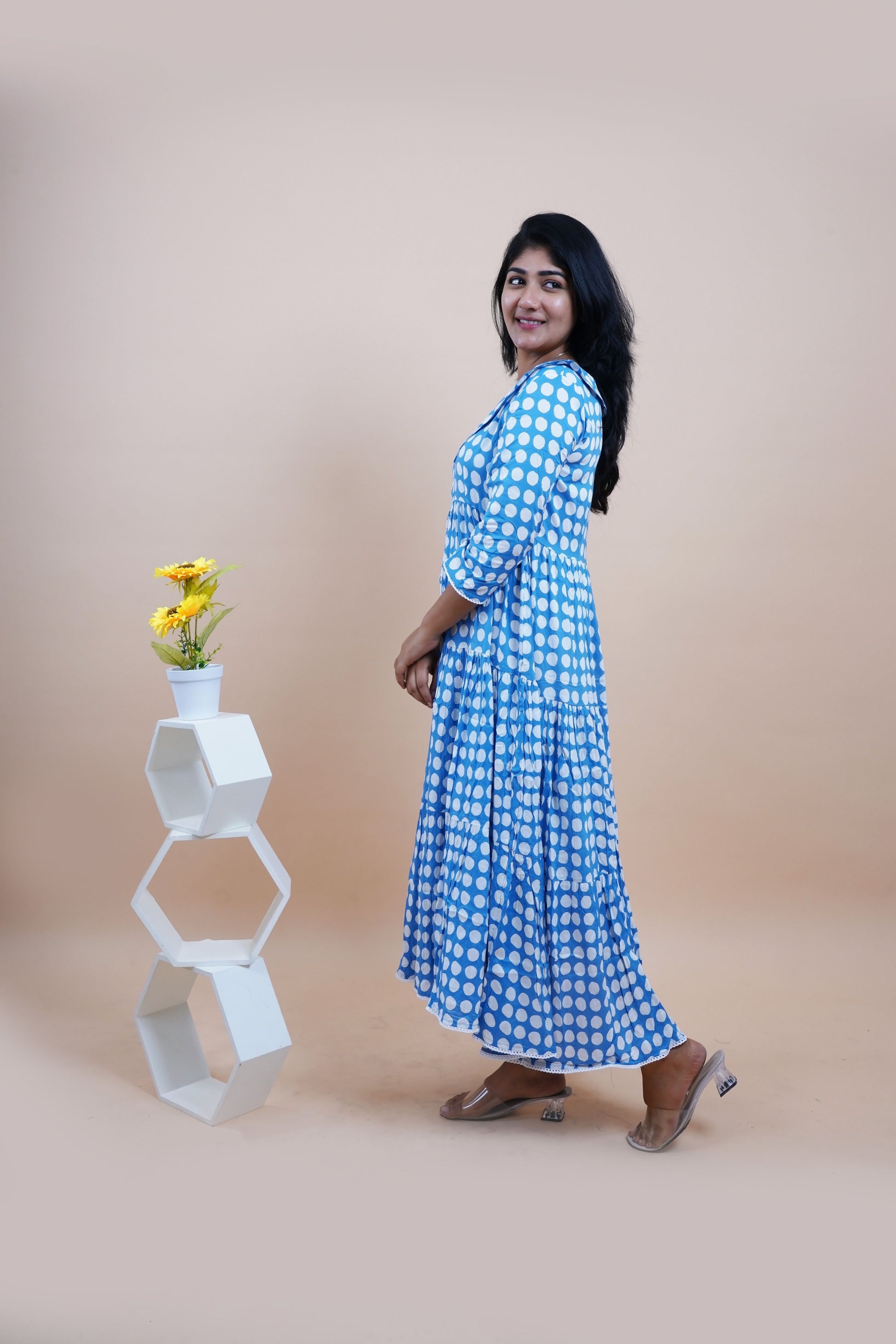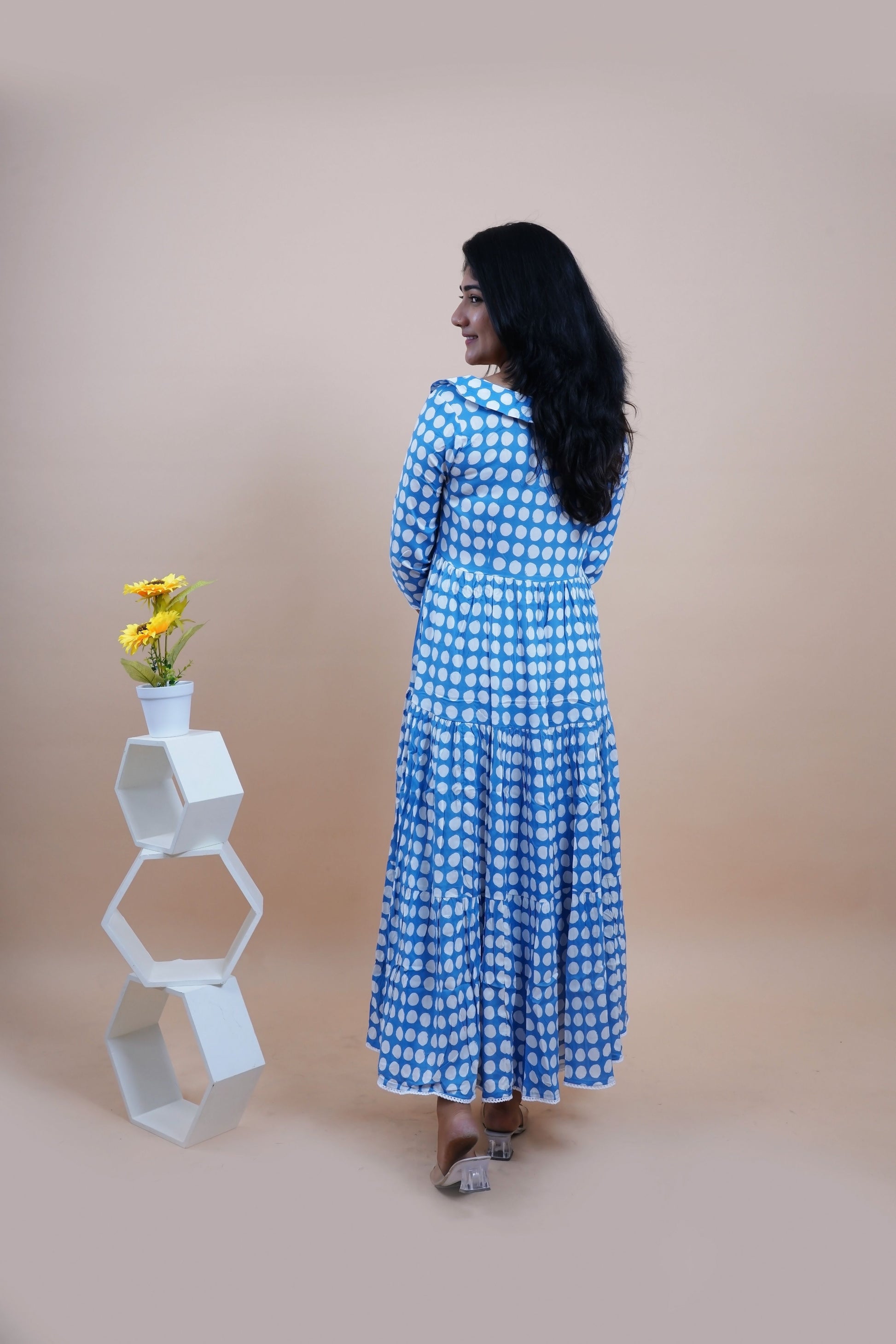 White Polka Printed Peter Pan Collar Tiered Fit & Flare Maxi Dress